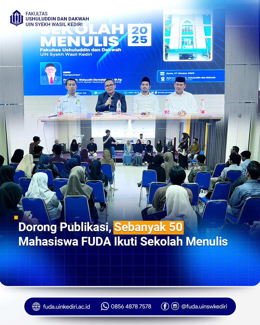 FUDA Newsroom - Fakultas Ushuluddin dan Dakwah Universitas Islam Negeri (UIN) Syekh Wasil Kediri menyelenggarakan kegiatan Sekolah Menulis 2025, Senin (27/10/2025) dengan menghadirkan Prof. Wahyudin D